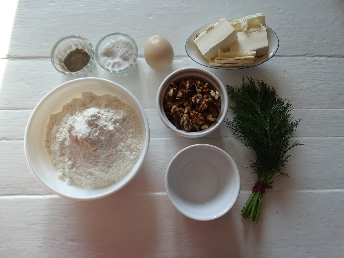 Не знаю, почему, но соленые печенья я люблю больше, чем сладкие. Мне кажутся они вкуснее и многофункциональней. Их можно использовать для фуршетной закуски. Например, подать такие печенюшки с рыбой, овощами, мясом или паштетом. Ими можно заменить хлеб, можно подать с молоком или сладким напитком. И вообще такие печенья и сами по себе вкуснющие. Это закусочное ореховое печенье готовится с зеленью. Но можно дополнить рецепт и другими продуктами. Например, вмешать в тесто кусочки мелко порезанной морковки или болгарского перца. Или же, орехи можно добавить, как молотые, так и нарезать их мелко и смешать с тестом. Точно так же добавляется твердый сыр, сушеные травы, и т.д. Ингредиенты: · Мука – 240гр; · Орехи (грецкие) – 80гр; · Сливочное масло – 100гр; · Яйцо – 1шт.; · Вода – 2ст.л.; · Зелень (укроп) – пучок; · Соль – 1ч.л. в тесто и 0,5ч.л. для присыпки; · Перец – 0,5ч.л. Приготовление: Орехи я не подсушиваю. Но можно потратить еще минут 5, и на противне пропечь грецкие орехи. После чег
