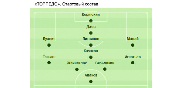 «Торпедо»: Корнюхин - к, Малай, Казаков, Литвинов, Даев, Лухвич, Гашкин, Игнатьев (Орловский, 70), Вязьмикин, Жвингилас (Махмутов, 86), Аваков (Тракис, 68).