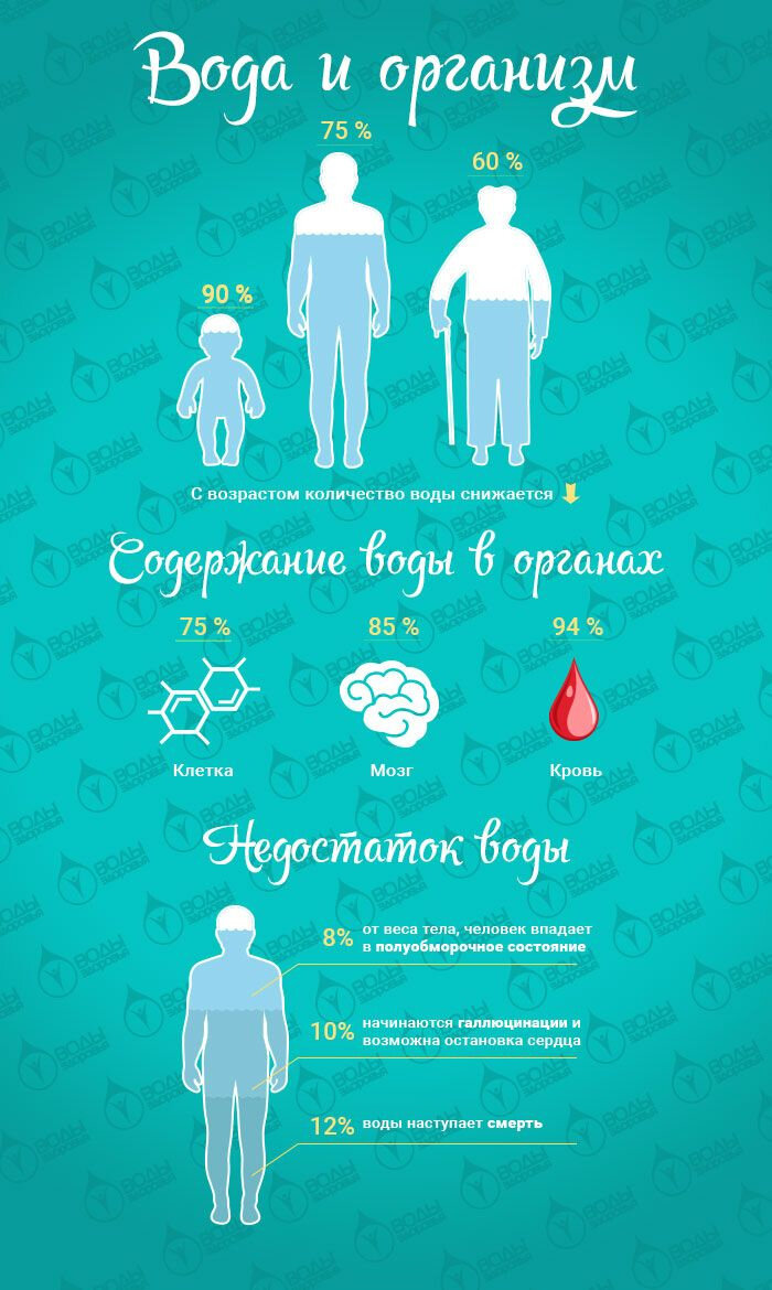 Известная истина — вода является источником жизни на Земле. Человек часть этой жизни, и не удивительно, что наш организм тоже состоит из воды. Точной цифры нет, так как это зависит от многих факторов. Например, от возраста человека — эмбрион состоит из 97% воды, человек средних лет – 65 — 70% и чем старше человек, тем процент воды в его организме меньше. Количество жидкости зависит от телосложения человека – чем он полнее, тем жидкости меньше.