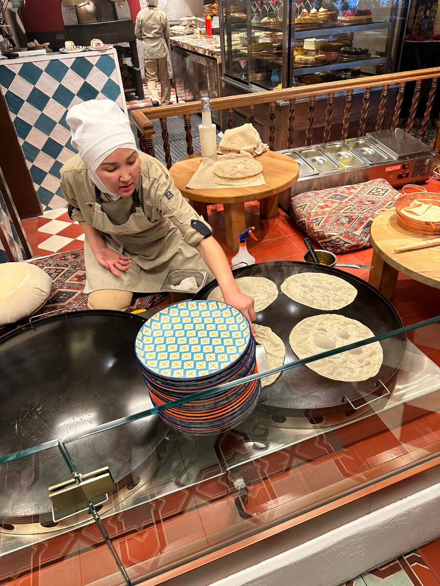 Просторное, светлое помещение, аутентичные детали и музыка, создающие ощущение восточной сказки. Казалось, что вот-вот из за угла выйдет Алладин с обезьянкой Абу. У входа сидят девушки, готовящие лепешки - выглядит очень колоритно.