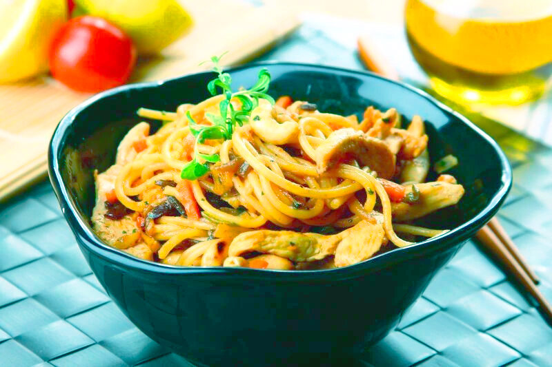 -Растительное масло 2 столовые ложки Шаг 1 Приготовьте макароны заранее и отложите в сторону. Шаг 2 На разогретом жире обжарить нарезанную курицу. В конце жарки добавьте арахис и кетчуп Hellmann'S пряный. Жарить немного. Затем добавьте овощи и макароны. Шаг 3 Полейте все это несколькими столовыми ложками воды и добавьте Fix Knorr. Шаг 4 Все вместе тщательно перемешать.