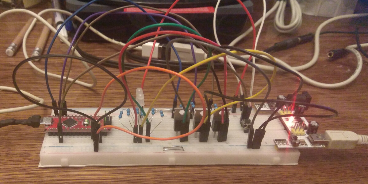 Привет, в этом посте хочу поделиться продвижением в разработке своего осветителя =) Мне удалось реализовать на таймере и прерывании переключение светодиодами по порядку или просто мигалка на RGB светодиодах ^-^ Реализовано это все на таймере TIMER0. Я использовал прерывание по переполнению. Для этого в регистре TIMSK0 таймера TIMER0 необходимо выставить бит TOIE0. И использовать веткор прерывания TIMER0_OVF_vect. Не забываем включить прерывания глобально sei(); Для проверки в железе накидал простую схемку на макетке. А вот тоже самое в виде схемы, она уже встречалась в постах ранее. Схемка в действии. Сам код. Ссылки с кодом main.c pindefs.h colors.h