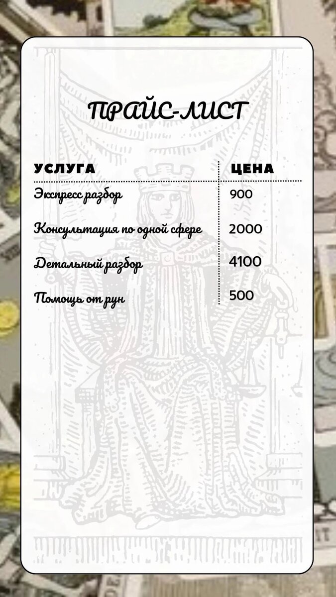 Всем привет! Меня зовут Анна. Я таролог со стажем уже почти 15 лет. Помимо Таро я практикую магическую помощь в трудных ситуациях (но берусь далеко не за каждого, потому что как оказалось, большинство тех, кто приходил с "помогите, на мне порча" никакой порчи не имели, а лишь получали карму за свои же поступки в прошлом) Вы можете обратиться ко мне за помощью в абсолютно любом вопросе: будь то личная жизнь, финансы, вопросы кармы и предназначения, и даже магических воздействий. К тому же, умею знаю и практикую работу с рунами, которые так же порой использую в своей работе, если вижу, что вам необходима подобная помощь. У меня есть отдельная группа в вк, где я отвечаю на все вопросы и мои личные сообщения всегда открыты для вас ☺: К тому же я есть в ватсап и телеграмм по номеру телефона 89656264418. Либо в телеграмм меня можно найти, вбив "tvoetaroann". В общем консультация будет проведена в максимально удобном для вас мессенджере. Ниже для удобства выкладываю прайс с описанием