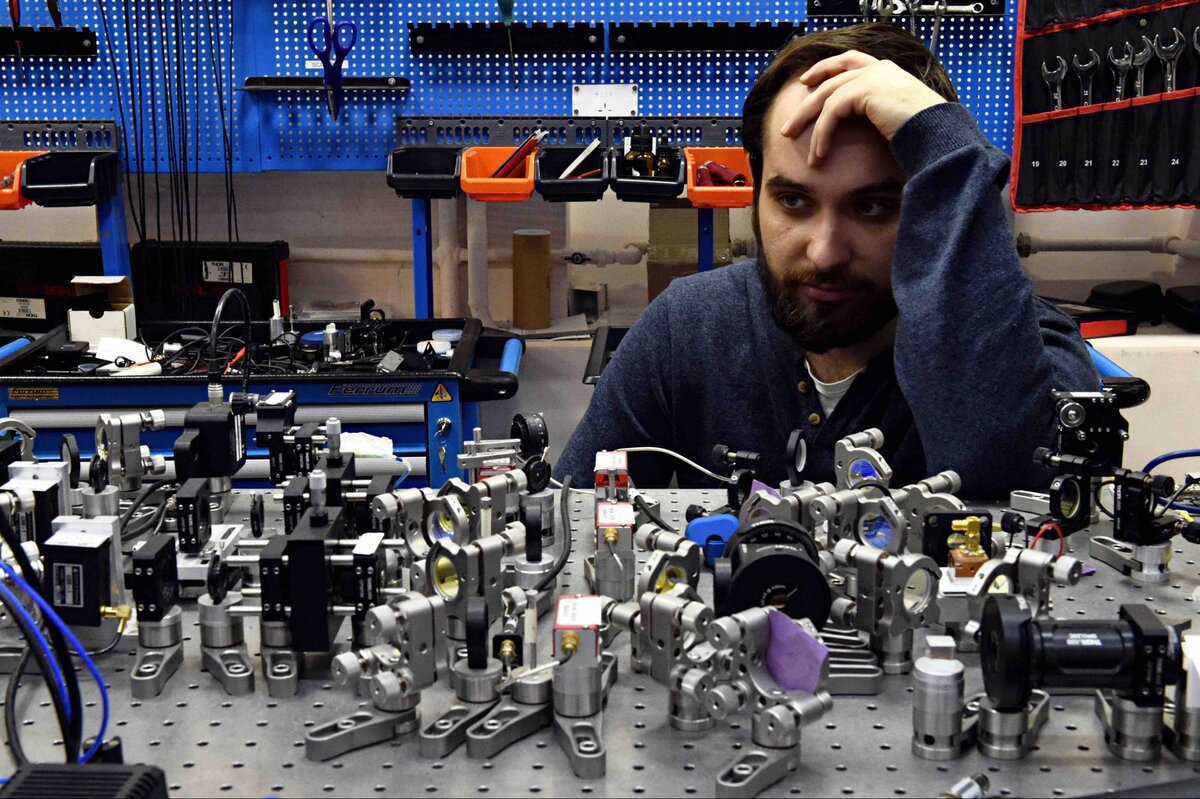 «Мы нагреваем образец металла, тулия. Пока его пары летят по трубке к основной вакуумной камере, мы тормозим и остужаем их с помощью лазера, — объяснил нам Даниил Першин, работающий в РКЦ с «атомным» квантовым компьютером. — Из печки атомы вылетают на скорости около 300 м/с, быстрее пули, но, прилетая в камеру, замедляются уже до 10 м/с.