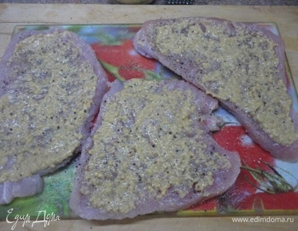 соль - 1по вкусу Шаг: 1 Мякоть индейки нарежьте на стейки. Посолите, поперчите и одну сторону каждого кусочка смажьте 1 ч. л. горчицы. Шаг: 2 Затем посыпьте зеленью и положите по кусочку ветчины. Шаг: 3 Посыпьте сыром и сверните стейки в рулетики, после чего закрепите их. Шаг: 4 Обжарьте со всех сторон в оливковом масле. Шаг: 5 Лук мелко нарежьте, добавьте к мясу и обжаривайте все вместе несколько минут. Затем влейте вино и бульон (или горячую воду). Накройте крышкой и тушите блюдо 20–25 минут. Готовые рулеты выложите в отдельную емкость, а сам соус загустите. Для этого