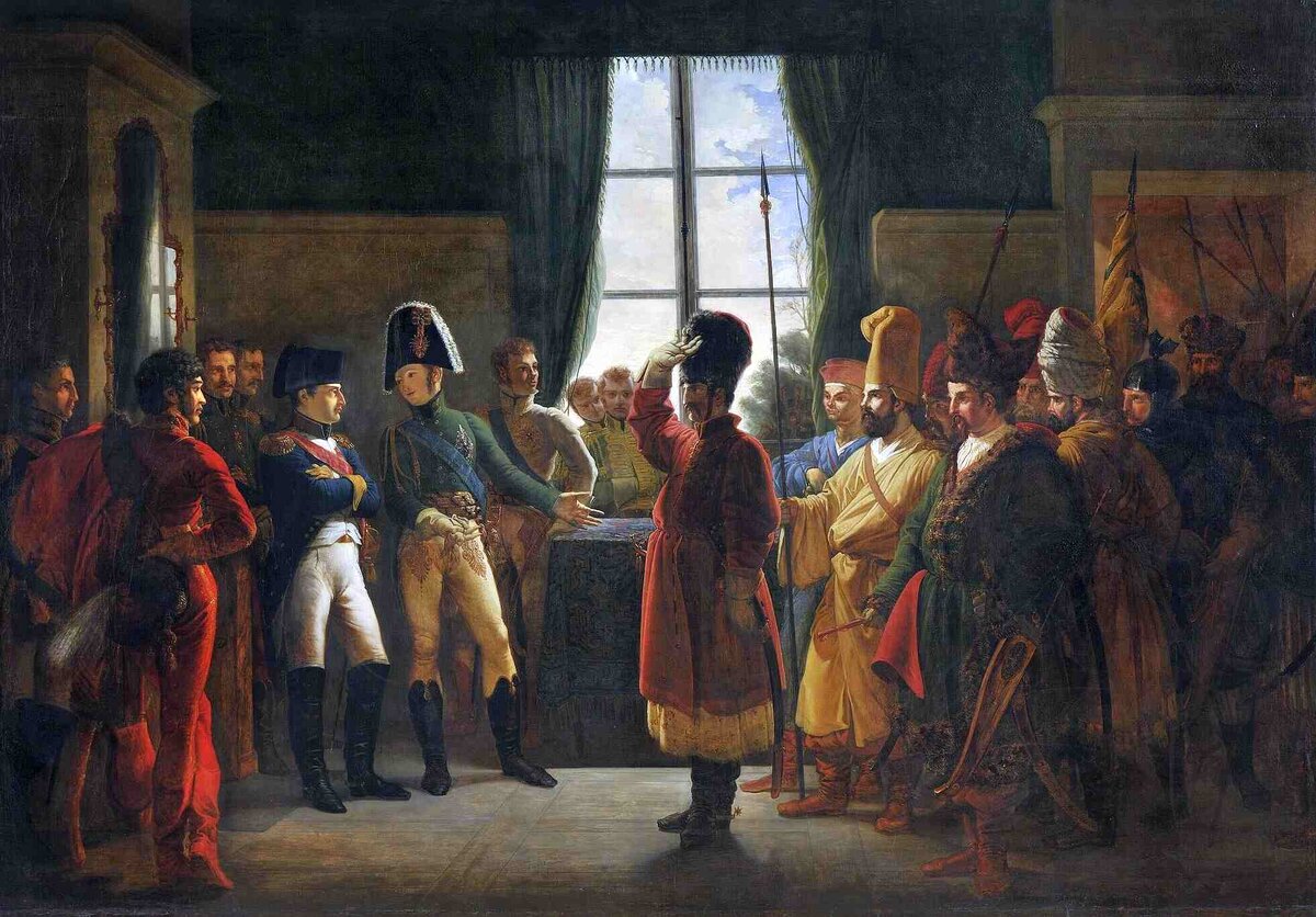 «Александр I представляет Наполеону калмыков, казаков и башкир русской армии (июль 1807 года)». Картина французского живописца Пьера-Ноласка Бержере, написана в 1807 году после заключения Тильзитского мира. Мирное соглашение двух императоров было воспринято с большим энтузиазмом во Франции, порядком уставшей от войн, которые продолжались почти без перерыва с 1792 года. Художник Бержере, ученик самого Жака-Луи Давида, запечатлел на своём полотне момент, когда после состоявшегося смотра российских войск, Наполеону были представлены всадники так называемой иррегулярной кавалерии: казаки, башкиры и калмыки. Едва ли живописец присутствовал на встрече в Тильзите: одежда всадников не похожа на казачью униформу того периода. Кавалеристы скорее напоминают характерных персонажей салонных картин-арабесок, выполненных в манере пафосного неоклассического стиля, моду на который ввел Ж.-Л. Давид. Воинов бескрайних российских степей помнили в Европе со времен Семилетней войны. Их колоритный вид дел