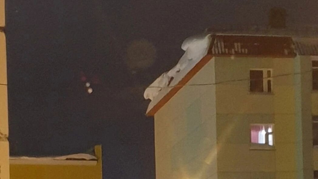В 9-ом микрорайоне на крыше дома скопился снег.