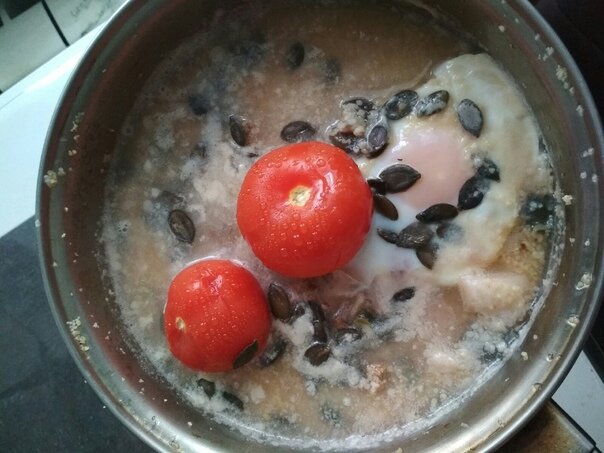 Подогрел воду в сковороде, заложил крупу чечевицы. Дал немного повариться. Далее добавил для разогрева остатки мяса, лука, зерна. Положил также яйцо пашот. Выключил плиту и оставил томиться.