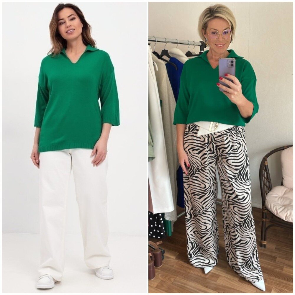 Здравствуйте, дорогие читатели! Меня зовут Ирина, я - стилист, и на этом канале показываю одежду и аксессуары с Wildberries такими, как они есть, то есть, из серии "ожидание/реальность". Мои параметры: рост 169 см, вес 70 кг, 96-78-106 ✅Основной канал: Стильно - не значит дорого! Ставьте лайк в поддержку канала, и давайте смотреть на мою сегодняшнюю покупку. Воротничок поло по-прежнему очень актуален, и я заказала на ВБ классный джемпер в моем любимом зеленом цвете (есть еще бежевый и синий). Размер единый (44-50), соответственно, для девушек в 44 размере он будет оверсайз, для девушек в 50 - более облегающим. На моих параметрах джемпер сидит достаточно свободно, как видите.