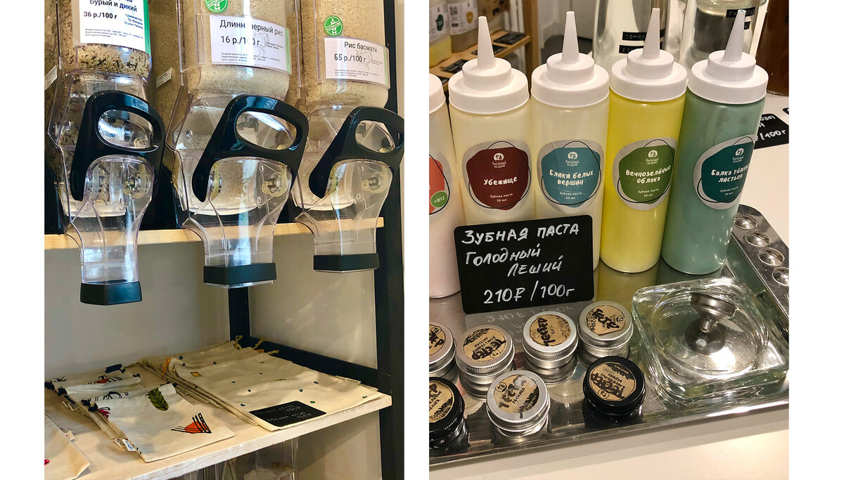 Недавно я выпустила ролик про закрытие моего любимого магазина без упаковки "Крупа". В нём можно было взять очень много товаров в свою тару и сократить потребление пластиковой упаковки! На фотографиях ниже - контейнеры с рычажком для круп и полка с зубной пастой, которую можно выдавить в свою алюминиевую баночку при помощи маленькой железной воронки справа.