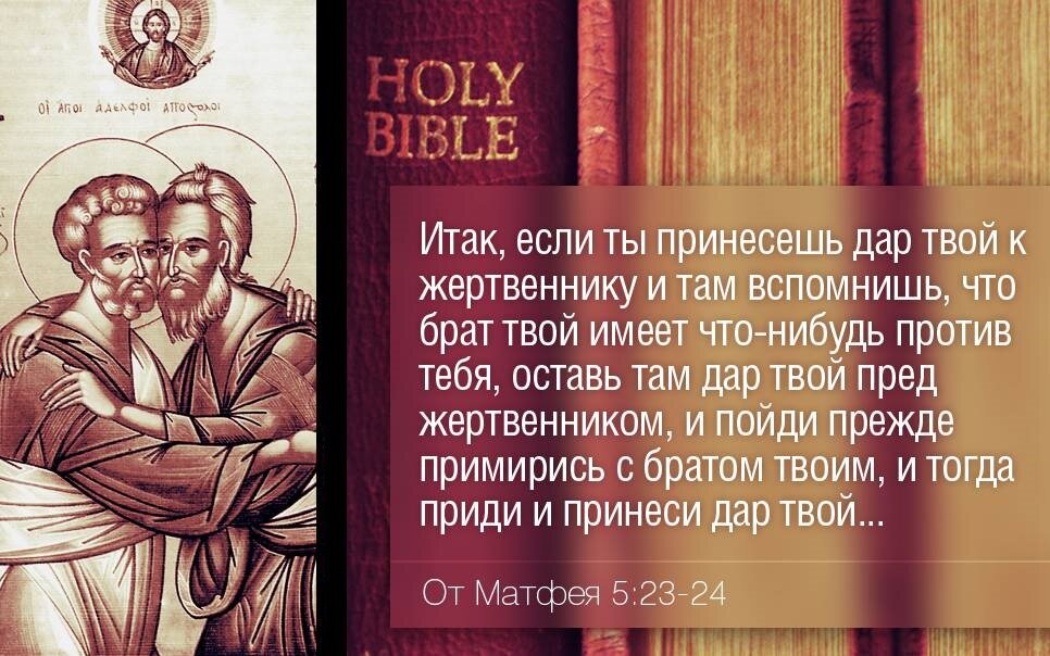 “Вы слышали, что сказано древним: «Не убивай, кто же убьет, подлежит суду». А Я говорю вам, что всякий, гневающийся на брата своего напрасно, подлежит суду; кто же скажет брату своему: “Рака”, подлежит синедриону; а кто скажет: “Безумный”, подлежит геенне огненной. Итак, если ты принесешь дар твой к жертвеннику и там вспомнишь, что брат твой имеет что-нибудь против тебя, оставь там дар твой, перед жертвенником, и пойди прежде примирись с братом твоим, и тогда приди и принеси дар твой. Мирись с соперником твоим скорее, пока ты еще на пути с ним, чтобы соперник не отдал тебя судье, а судья не отдал бы тебя слуге, и не ввергли бы тебя в темницу; истинно говорю тебе: ты не выйдешь оттуда, пока не отдашь до последнего кодранта” (Мф. 5:21-26).