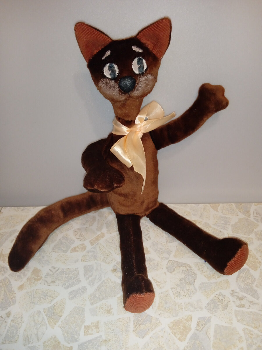 Давно не шила игрушечных котов, а сегодня нашла красивые обрезки велюра, и кот родился почти сам собой. Шила без выкройки, ориентируясь на форму и размер обрезков ткани, и старалась хоть немного соблюдать пропорции игрушки. Сначала выкроила уши из самых мелких кусочков. Затем, к ушам добавилась голова. Сразу сшила и вывернула уши, затем пристрочила их к одной детали головы, затем пристрочила вторую деталь. Вывернула и набила голову синтепоном. Форму верхних лап продиктовали куски ткани, получится кот, любящий обнимашки. Лапы тоже сразу собрала и набила синтепоном. В верхнюю часть боковых швов туловища вшила лапы. Затем набила туловище синтепоном и, вручную, пришила голову. Хвост набивала чуть слабее, чем остальные детали игрушки. Так как туловище внизу прямоугольное, выкроила круглое донышко. Хвост вшила в шов между туловищем и донышком сзади. Нижние лапы, или ноги, получились с подошвой из той же ткани, что и передняя часть ушей. Собрала, набила и пришила ноги к туловищу. Затем накрыл