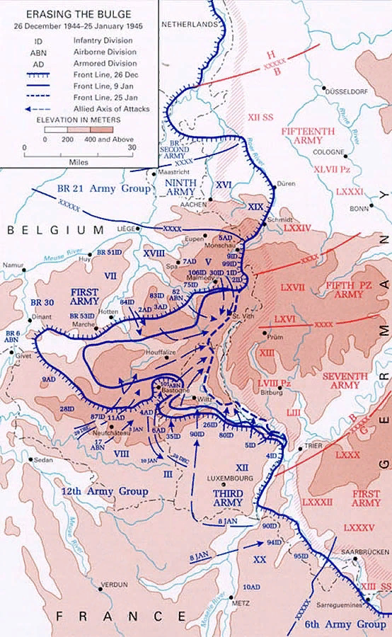 К началу декабря продвижение союзников остановилось, Монтгомери усилил критику Эйзенхауэра. 28 ноября на встрече двух генералов Эйзенхауэр согласился, что план главного штаба союзных экспедиционных сил провалился. 5 декабря в Маастрихте Монтгомери говорил, что единственный способ преодолеть застой – вынудить немцев перейти к маневренной войне. Именно это спустя 11 дней и сделали немцы. К декабрю 1944 г. бои на Западном фронте приобрели позиционный характер. Союзники растеряли наступательный потенциал, а Германия попыталась переломить ситуацию. Союзники надеялись на наступление и прорыв линии Зигфрида, но получили контрудар. Для немцев контрудар на Западе носил не только военный, но и политический характер. Победа позволила бы подтолкнуть Англию и США на пересмотр стратегии или даже на сепаратные переговоры.