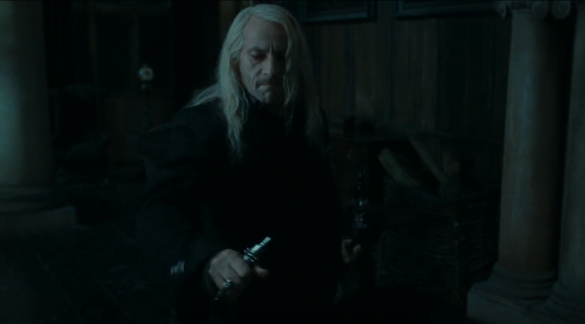 В начале фильма Волан-де-Морт забрал у Люциуса палочку, оставив тому лишь рукоятку. Именно поэтому в момент сражения в особняке Малфой старший не смог противостоять Гарри, который оглушил его заклинанием.