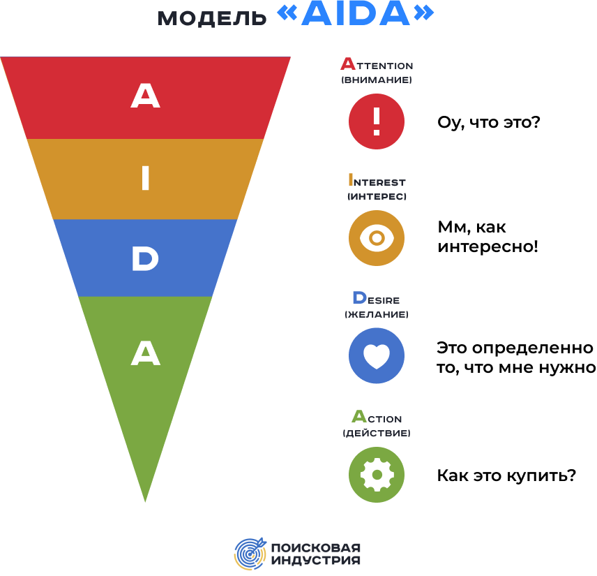 Раньше модель AIDA использовали даже водители автобусов и таксисты. Помните, у вокзалов можно было услышать названия самых популярных маршрутов и их цены? Только подошли, а уже слышите: «Автобус в Санкт-Петербург, 1000 рублей с человека». Это та же модель: сначала голосом привлекают внимание; затем, произнеся маршрут, вызывают интерес; далее называют цену, а если задаете вопрос, усиливают предложение тем, что, сев раньше, можете выбрать место или, сев сейчас, сразу поедете, так как осталось последнее место.