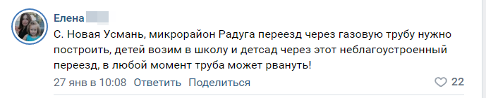 Все дело в дороге. Шквал однотипных комментариев обрушился на губернатора Воронежской области Александра Гусева «ВКонтакте». Под постом, где глава региона говорит об утверждении инвестпрограммы на три года, люди массово пожаловались на проблему в микрорайоне Радуга села Новая Усмань. Местные утверждают, что с дорогой (называют ее дорогой жизни) через газовую трубу, соединяющей микрорайон со всеми социальными объектами: школой, детским садом, больницей, аптекой, магазинами, настоящая беда. Проезжая часть вся разбита, сравнивают ее с Американскими горками, однако ремонтировать ее якобы никто не берется. Да и вообще, говорят, по этой дороге даже ездить нельзя. - Мы когда покупали там жилье, была дорога. А потом получается, что людей просто обманули! Это единственная дорога, по которой можно добраться до инфраструктуры, - пишут Гусеву. Всем жалующимся ответили однотипным комментарием, который подготовили по поручению губернатора: «Собственник земли уже достаточно много лет назад нарезал уч