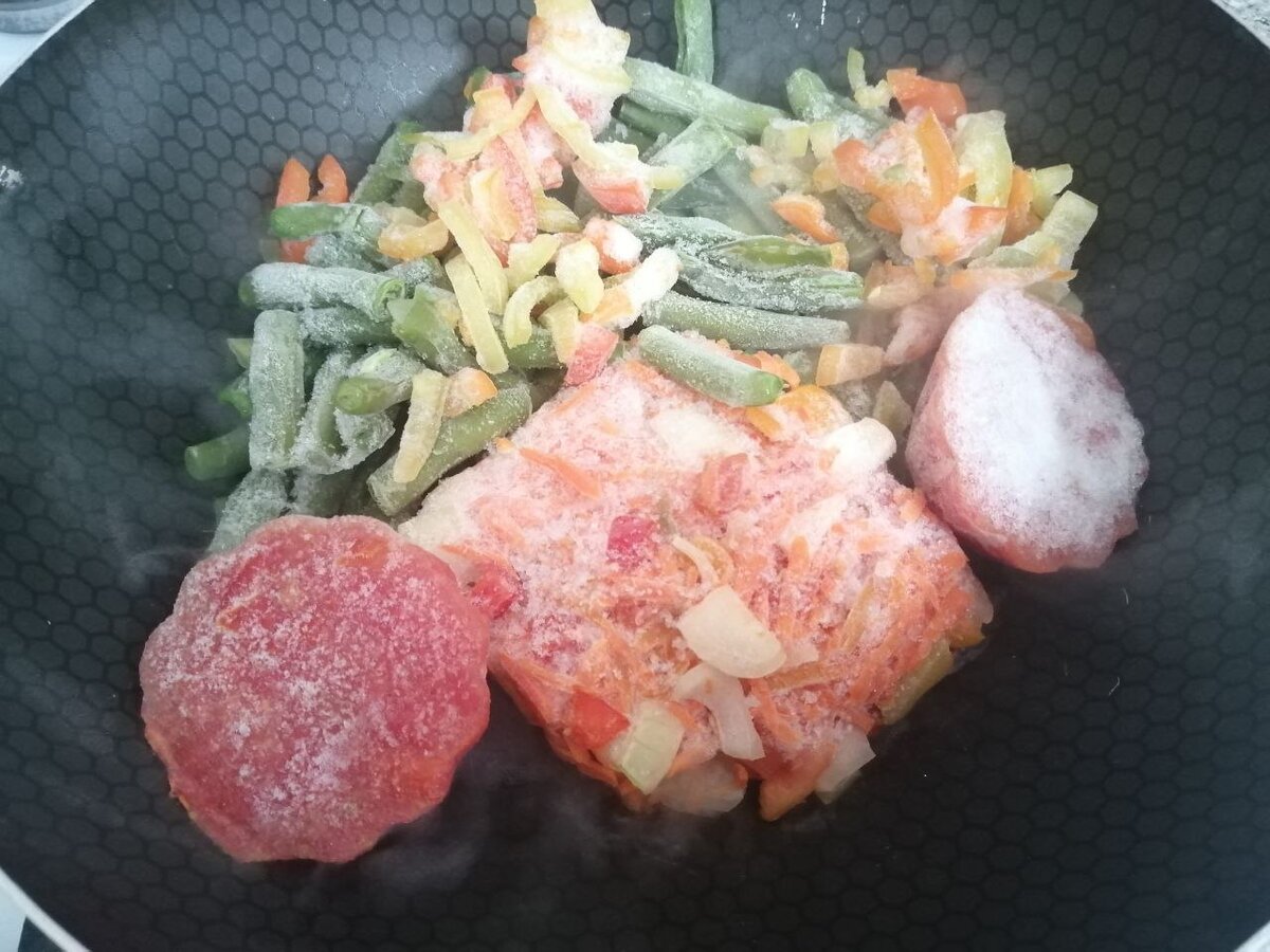 Я его слепила из того, что было😊 Провела я тут ревизию своей морозилки. Периодически пересчитываю запасы😁 Из не приятного - у нас почти закончилось своё мясо, придется опять покупать. Из последнего фарша налепила котлет на один ужин и несколько небольших подносов фрикаделек, их обычно в суп добавляю, или в подливе тушу и подаю с любым гарниром. А вот фруктово-овощные запасы ещё приятно радуют глаз и хоть они и заморожены, но душу греют. Но сегодня не об этом. Достала я последний пакетик со стручковой фасолью. На глаза попалась овощная смесь, в её составе лук, морковь, перец сладкий, томаты, Выложила всё это в глубокий сотейник, решила к содержимому добавить ещё немного перца сладкого, он у меня есть в заготовках отдельно и отправила два кусочка замороженного томатного пюре, в сезон перетертые томаты замораживала порционно в маленьких формочках для кексов. Когда овощи полностью растаяли, и выпарилась лишняя жидкость, добавила немного растительного масла и крупно-порезанный картофель