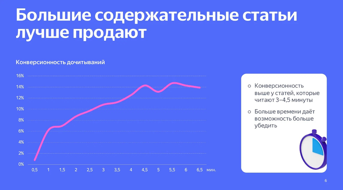 В Дзен и теперь уже в отделившихся ПромоСтраницах Яндекса высокая активность лонгридов. Это действительно так, ведь если длинная статья является экспертной, уникальной и актуальной в данный момент времени, то она не только интересна сама по себе, но еще и обладает эффектом усиления доверия.