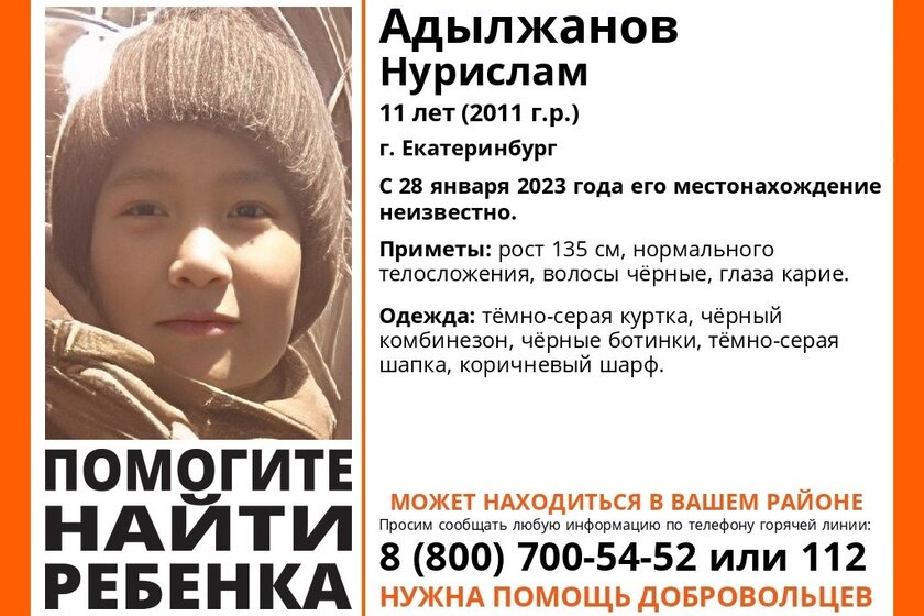 В Екатеринбурге в районе Сортировки пропал 11-летний Нурислам Адылжанов. Его местонахождение неизвестно с 28 января. Ребенок не вернулся домой после прогулки с друзьями. Ранее он из дома не убегал. На момент пропажи мальчик был одет в темно-серую куртку, черные ботинки, черные штаны и темно-серую шапку с помпоном. Всех, кто знает что-либо о местонахождении разыскиваемого, просят сообщить информацию по телефонам: 8 (962) 316-55-42 (отряд «Прорыв»), 8 (800) 700-54-52 («Лиза Алерт»), 8 (343) 356-42-11 (дежурная часть отдела полиции № 11) или 02 (102 по мобильному). В Новосибирске школьница применила болевой захват и отобрала у грабителя телефон В страшном пожаре на Кубани погибли дети из многодетной семьи