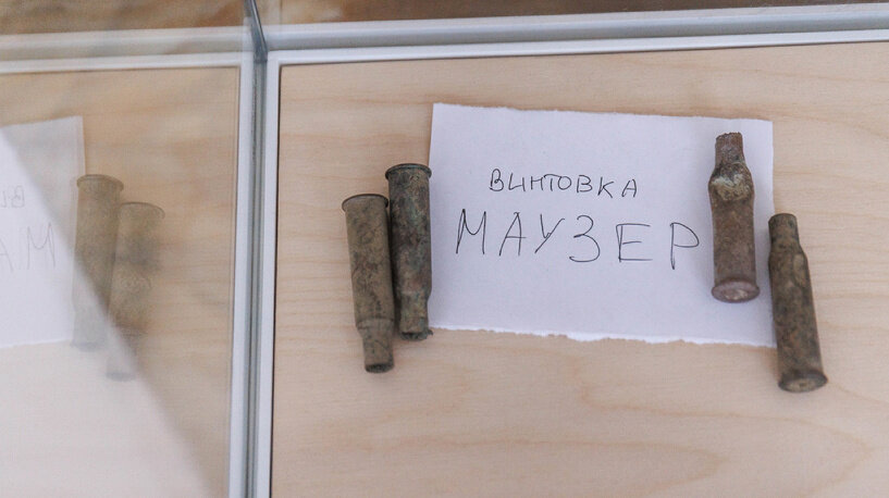 Была идея показать слои шурфа. В верхнем слое, который мы исследовали, под травой лежали винтовки и гильзы от маузера и винтовки Мосина, но больше всего было найдено следов нагана — это был основной револьер, который применяли для приведения приговора в исполнение. Часть из них датирована: производство Луганского завода в пределах 1937–1939 годов, это косвенная датировка, позволяющая атрибутировать предметы и соотнести их с репрессиями.