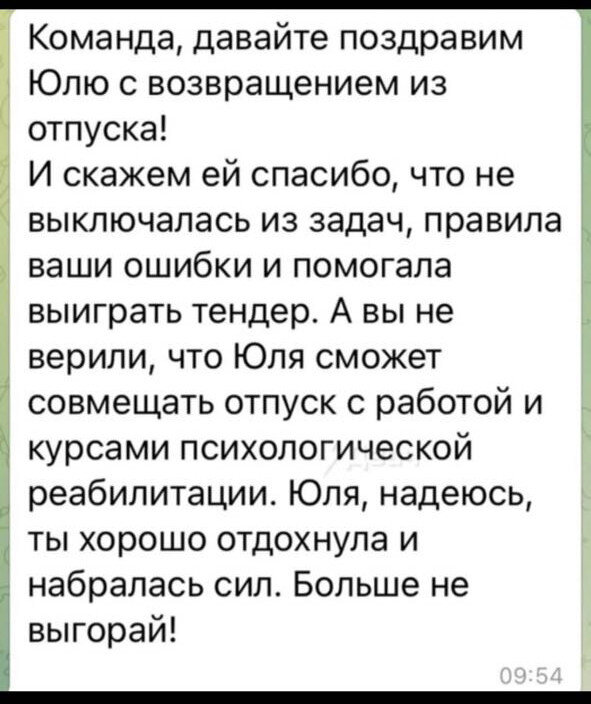 Как сказал известный банкир Морган: «Я могу сделать годовой объем работы за девять месяцев, но не за двенадцать». Отдыхать надо уметь. Выключаться из задач и поехать кататься на сноуборде, нюхать фиалки или зазырить новый фильм, о котором столько говорят. Спланированный регулярный отдых – это подпитка сил на текущую работу. Не надо делать ставку на отпуск через три месяца. Подпитывать свои ресурсы надо здесь и сейчас и это постоянный процесс. Следить за тем, чтобы отдых не выходил за рамки – это да. Если вы скроллите рилсы инсты не час, как запланировали, а три, у вас проблема. И все же «рабочие выходные» — это не есть правильно.