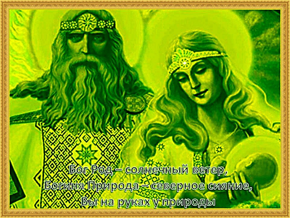 Славянские боги: Бог Род - солнечный ветер, Богиня Природа - северное сияние, Вы на руках у Природы. Требуют ли славянские боги поклонения? Нет, они ни в чём не нуждаются. Зачем повторять: "Слава, слава, слава". В 14 веке святитель Григорий Палама заменил слово "Свет" на слово "Слава". Солнечный ветер и северное сияние не нуждается не в словах "Слава" и слова "Свет".