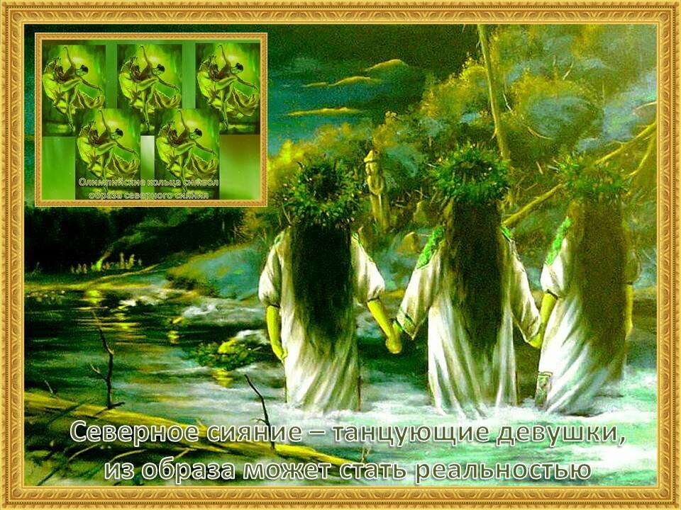 Образ северного сияния может стать реальность. Олицетворение северного сияния - танцующие девушки, этот образ может стать реальностью, танцующими девушками. Что наверху, то и внизу. Солнце любит землю, на солнечный ветер земля отвечает северным сиянием. Солнечный ветер - мужчину мы не видим, только северное сияние - женщину мы видим. То что видим называется счастье, на самом деле, если так можно выразиться, детский вариант.