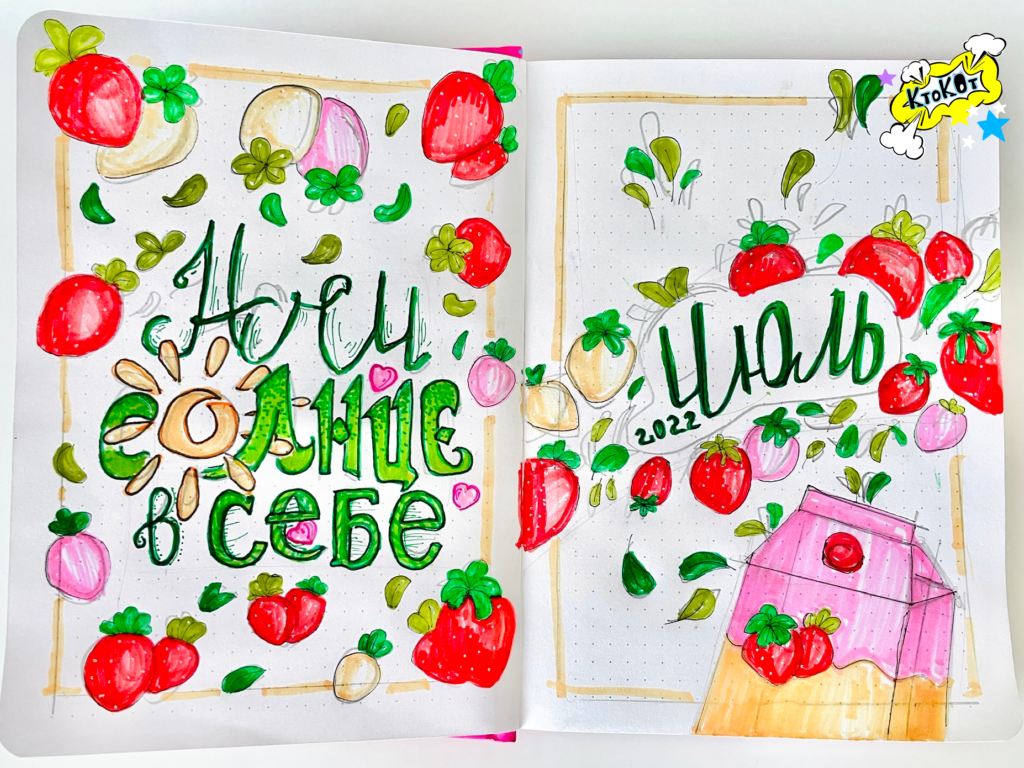 Сейчас зима, но уже так хочется чего-то вкусного и летнего! Клубнику я очень люблю и решила вам показать как летом оформила свой личный дневник. Но в клубничном стиле можно оформить и зимой. Вместо июля написать февраль и наслаждаться вкусными листочками!) ЛД-это личный дневник или его еще называют Буллет журнал. Здесь можно следить за своими планами, эмоциями, желаниями, чувствами. Я не очень люблю вести простой дневник, но люблю оформление и рисование. Люблю красиво писать. И в этом мне помогает ЛД. Очень полезное занятие заводить новые привычки и вводить их с помощью Личного Дневника. Интересно наблюдать за своим настроением!) 🌸 Итак, поехали)… 🌸 Первый разворот. Здесь я не стерла карандаш, так как намного наглядней видно мои начальные зарисовки и расположение по композиции по страничке. У меня солнышко и клубника ассоциируются вместе. Что я и изобразила) Второй разворот. Ну куда же без плей-листа и моих желаний. Конечно их хочется записать и потом наблюдать как поменялись твои