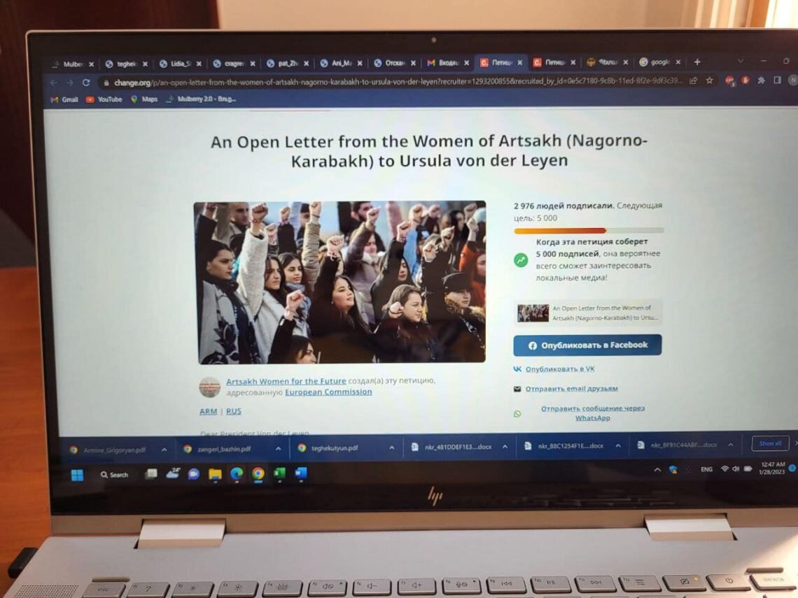 Ադրբեջանական կողմը կարողացել է արգելափակել և ջնջել Եվրահանձնաժողովի ղեկավար Ուրսուլա ֆոն դեր Լյայենին ուղղված Արցախի կանանց առցանց հանրագիրը։ Այս մասին հայտնում է «Արցախի կանայք հանուն Արցախի ապագայի» քաղաքացիական նախաձեռնությունը։ «Չբավարարվելով դեկտեմբերի 12-ից Արցախում 120 000 հայերի շրջափակմամբ՝ ադրբեջանցի սադրիչները գտել են հունվարի 26-ին կայքում տեղադրված առցանց հանրագրի հղումը արգելափակելու միջոց change.org և ջնջել այն», - ասվում է նախաձեռնության Facebook-ի էջում տեղադրված գրառման մեջ։ Հանրագրի նախաձեռնողները դատապարտել են այն փաստը, որ «Արցախի կանանց օգնության կոչերը լռեցվել են Ադրբեջանի կողմից»։ Ավելի վաղ նախաձեռնությունը հայտնել էր, որ խնդրագիրը հաջողությամբ հավաքել է ձայներ (24 ժամում գրեթե 4000 ձայն), սակայն հաքերային հարձակման է ենթարկվել Ադրբեջանի կողմից: Ուրսուլա ֆոն դեր Լյայենին հասցեագրված հունվարի 26-ին հրապարակված խնդրագրում արցախցի կանայք կոչ են արել նրան ամեն ինչ անել Ադրբեջանի շրջափակումը դադարեցնելու համար։ «Մենք մեր երեխաների հետ սովամահ ենք լինում և սառչում ամբ
