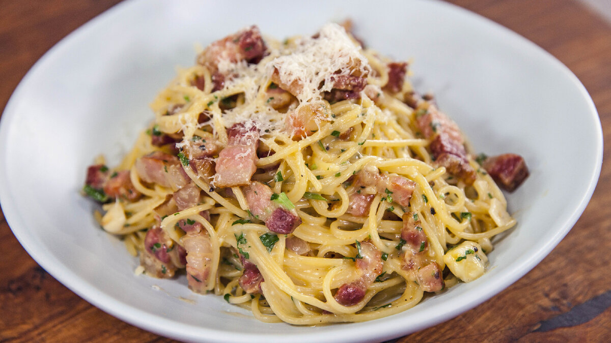 Спагетти карбонара — хоть блюдо и итальянское, оно имеет хорошую популярность во всем мире, в том числе и у нас. ля карбонары нужно выбирать такие ломтики бекона, где больше мяса и меньше жира. Если его будет много, то, вытапливаясь при готовке, он сделает пасту слишком тяжелой. Можно подавить чеснок и бросить в поджарку. Но, чтобы блюдо приобрело утонченный, еле уловимый аромат, достаточно потомить ломтики чеснока в масле и убрать из сковороды спустя пару минут. Не обязательно использовать в рецепте карбонары спагетти — выбирайте любимые макароны из 500 видов всевозможной пасты. Но только из твердых сортов пшеницы.