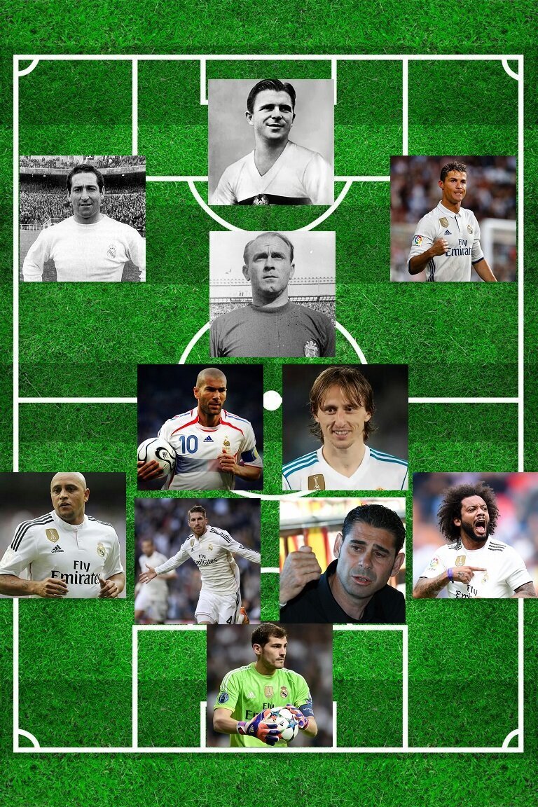 В этой статье я покажу вам каким, на мой взгляд, должен быть состав Реала всех времён и народов. Поехали! 1. Вратарь Касильяс На мой взгляд, Касильяс является самым сильным вратарём среди игравших за Реал. Конечно, я многих не видел, но из тех, за кем я наблюдал он играл лучше всех. Касильяс отдал всю карьеру Реалу. Он попал в академию "сливочных" в 9 лет и прошёл весь путь до основного состава. Сейчас он доигрывает свою карьеру в Порту. 2. Левый защитник Роберто Карлос Роберто Карлос родился в 1973 году в городе Сан Паулу. Он поиграл во многих клубах мира и даже в Анжи. Но лучшие годы он, понятное дело, провёл в Реале. Так же он сильно запомнился болельщикам Реала, поэтому он обязан быть в моем составе. За сборную Бразилии выиграл чемпионат мира в 2002 году. После карьеры игрока в 2012 году стал тренером Анжи. Потом поехал работать в Турцию. А в 2015 вернулся в футбол, и играл за индийскую команду, но сыграл только три матча. Стал тренировать эту же команду. В 2018 году стал играть