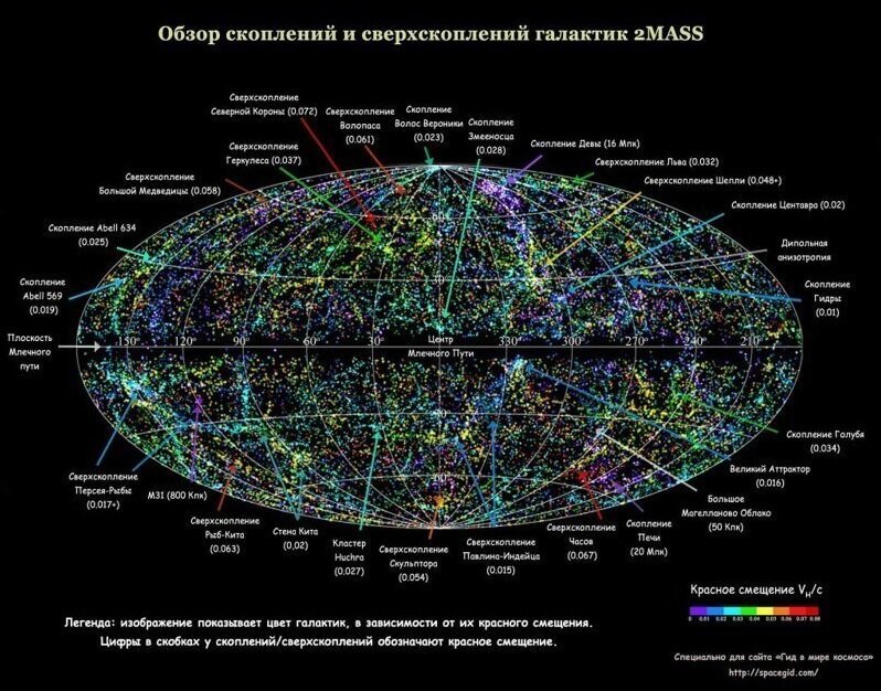 За последние несколько десятилетий наше понимание Вселенной значительно расширилось. Однако космос все еще хранит множество тайн, и Великий аттрактор — одна из них. Панорамный снимок неба в инфракрасном диапазоне, на котором запечатлены все наблюдаемые за пределами Млечного Пути галактики / © IPAC/Caltech/Thomas Jarrett/Wikipedia Common Что же мы видим? Может, это сверхплотное скопление темной материи? Или же современная теория возникновения массы и движения неверна? Астроном Алан Дресслер из Института Карнеги назвал эту недостающую концентрацию вещества Великим аттрактором. Скрытый аттрактор Способен ли Млечный Путь нестись сквозь пространство — подобно вращающемуся диску, не давая разглядеть источник далекого гравитационного аттрактора? Может ли там находиться сверхмассивное скопление галактик (которое должно быть эквивалентно 10 тысячам галактик Андромеда), которое мы не можем разглядеть из-за плотного слоя пыли внутри диска Галактики? В конце 1990-х команда ученых начала использ