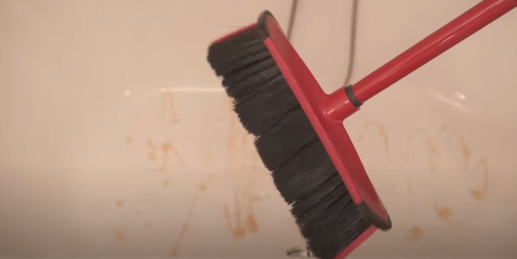 Оказывается, ванну можно очистить от различных загрязнений следующим интересным образом. Для этого необходимо найти дома веник или щетку с длинной ручкой. Далее ванну необходимо промыть при помощи душа. Затем в ванну нужно налить немного жидкости для мытья посуды. К этому нужно добавить немного пищевой соды. И осталось окончательно очистить ванну при помощи щётки или веника.