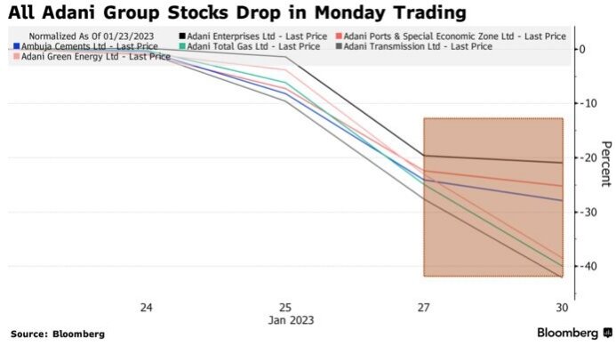 Все акции Adani торгуются с понижением, при этом некоторые из них лишились ранее достигнутых результатов 413-страничная попытка миллиардера Гаутама Адани восстановить уверенность в своей бизнес-империи не находит отклика у инвесторов, поскольку потери на фондовом рынке углубляются, а основные долларовые облигации падают до новых минимумов. Акции всех фирм Adani Group резко упали в понедельник, несмотря на продолжительные опровержения индийского конгломерата на выходных против обвинений в мошенничестве со стороны Hindenburg Research. Трехдневная распродажа теперь стерла рыночную стоимость почти на 72 миллиарда долларов на фоне продажи акций флагманской компании Адани, которая должна была подчеркнуть восхождение магната на мировой арене. В то время как Adani Group представила обвинения Гинденбурга как необоснованные и нападки на саму Индию, сага возродила давние опасения инвесторов по поводу корпоративного управления конгломерата. Это также угрожает ослабить более широкое доверие к Индии