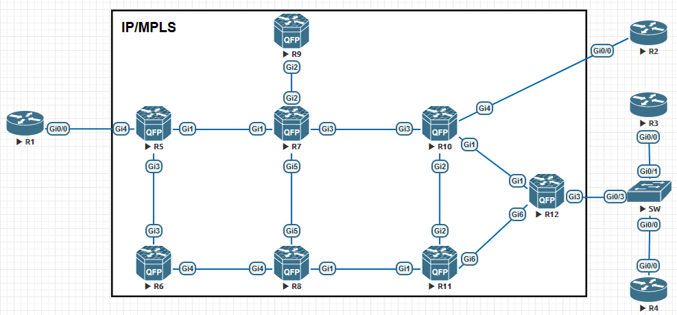Как видно из топологии CE(R3) подключается через SW, на PE(R12) будем выполнять настройки в