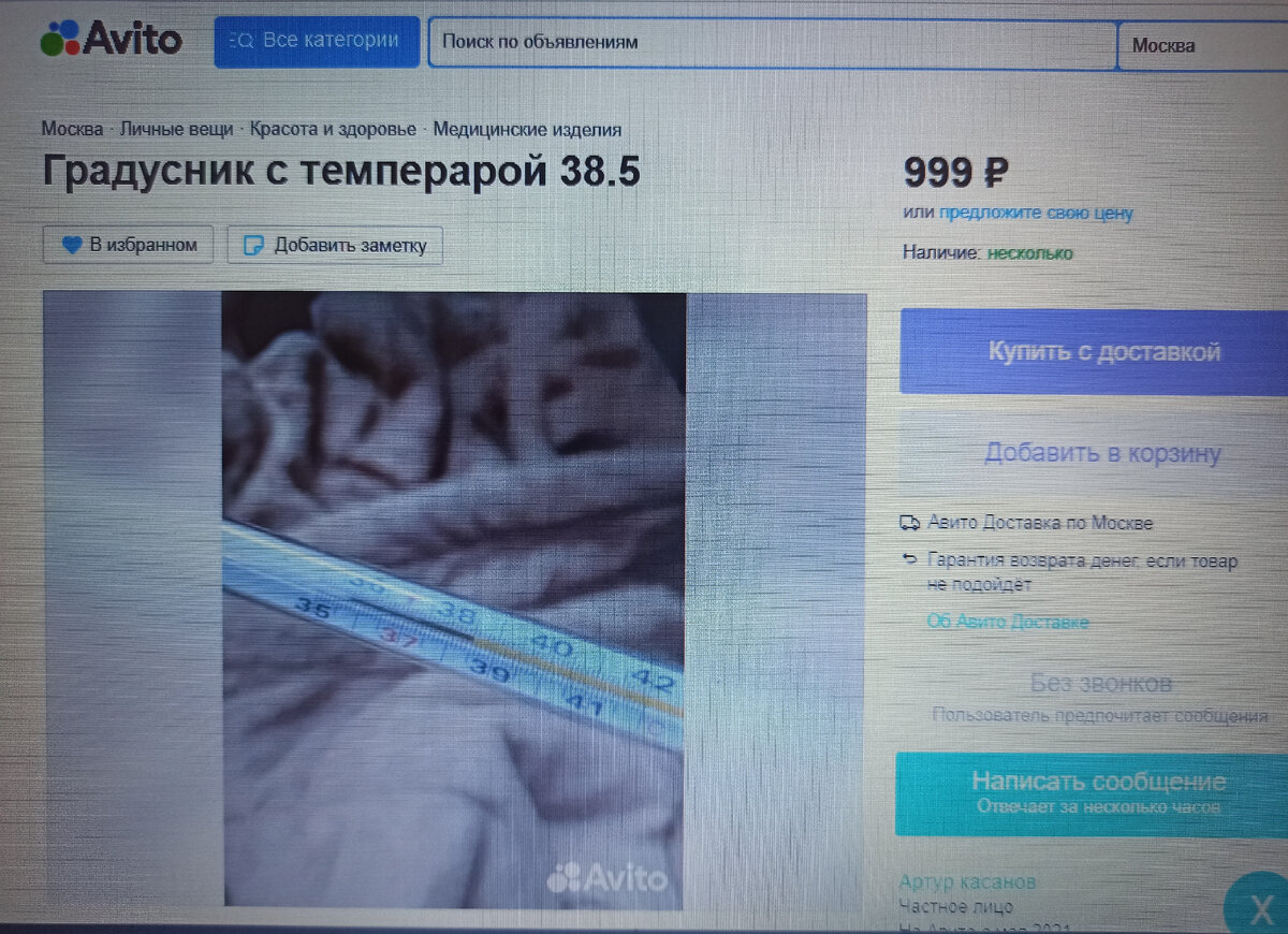 Здравствуйте! Сегодня волею судеб наткнулся на одно интересное объявление на Авито. Продавец Артур предлагает градусник с температурой 38,5 всего за 999 руб. В описании описаны свойства чудо градусника: возможность не пойти на учебу, работу, отложить встречу и т.д. Продавцу в описании посоветовал бы дописать, что градусник ищет нового хозяина устал от постоянных перегревов. Пишите свои варианты в комментариях, что надо улучшить в описании товара, чтобы быстрее продать сие чудо.