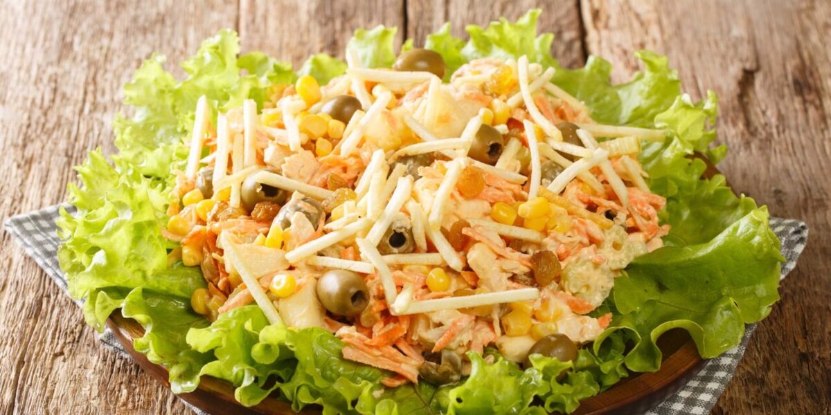 Надоели привычные салаты? Тогда попробуйте этот вариант из Латинской Америки! Время приготовления Ингредиенты Приготовление 1․Куриное филе отварите в подсоленной воде примерно за 25 минут. Остудите и нарежьте небольшими кусочками 2․Изюм на 5 минут замочите в горячей воде. Слейте всю жидкость и подсушите сухофрукты. 3․Морковь натрите на крупной тёрке или тёрке для моркови по-корейски. 4․Смешайте курицу с морковью, изюмом и кукурузой. 5․Майонез соедините с маслом, уксусом и горчицей. Заправьте салат и перемешайте. 6․Выложите его на салатные листья. Сверху добавьте картофельную соломку и, если хотите, оливки.