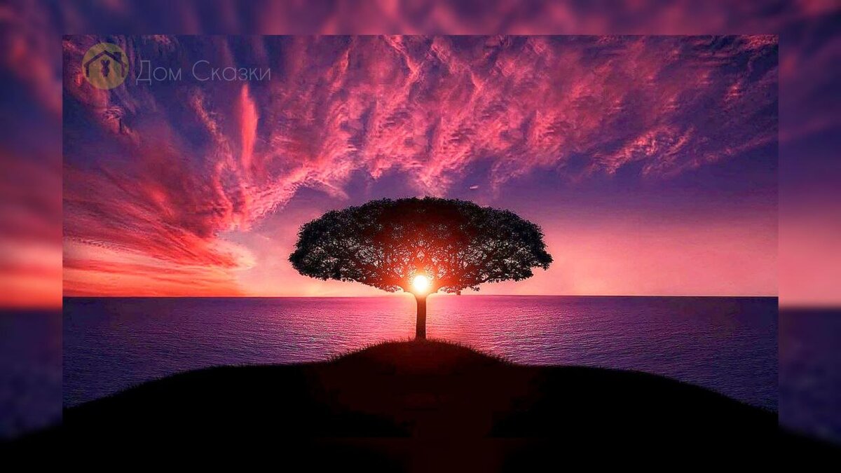 В далёкие времена, когда на земле ещё не ступала нога человека, а океан покрывал почти всю планету, одно гигантское дерево проглотило солнце. Запутало его в своей непролазной кроне, поймав на закате. В результате, солнышко сколько ни билось, всё равно не получалось выпутаться. Поэтому взмолилось светило: — Отпусти меня, дерево! Но хищное растение не соглашалось: — Нет! Ты вкусное. Мне нравится, как ты согреваешь меня и подсвечиваешь мои листья. — Но я должно освещать весь мир! Всем дарить тепло! — увещевало солнце, — К тому же, без моего тепла всё живое на земле погибнет! Отпусти! Отпусти! Но хищное растение было глухо к мольбам и лишь усмехалось. Однако, без солнца мир стал быстро меняться. Сначала пропали волшебные в своей красоте закаты и рассветы. Далее, перестал дуть ветер. И в конце концов, наступила тьма и холод. И только жадное дерево светилось своей кроной во мгле. Дереву нравилось, что оно осталось одно. Но потом ему стало не по себе, потому что краденое солнце начало потихон