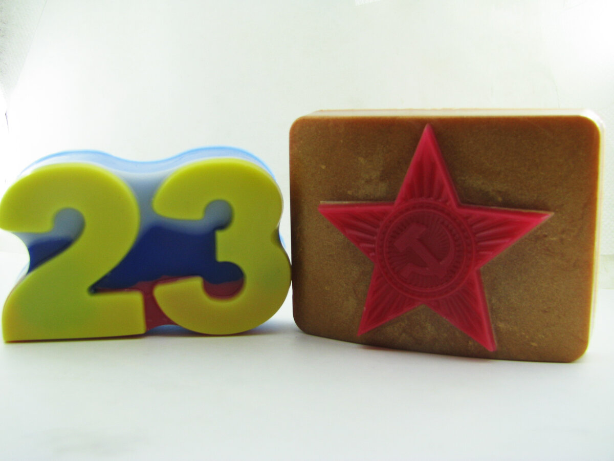 День добрый! Сегодня будем делать два разных мыла указанных на заглавном изображении. Изготовление очень простое и не требует каких-либо особых навыков. Ссылки на формы и расходные материалы будут предоставлены в конце статьи. Мыло "Бляха" Здесь мы условно разделяем форму на две части: звезда и собственно сама бляха. Для звезды использована белая основа и пигмент гелевый "Красный, кристальный". Здесь самое важное залить четко по уровню звезды и не выше, что бы мыло не растеклось по "бляхе". На основную часть мыла белая основа с добавлением прозрачной. Дело в том что для окрашивания "бляхи" лучше всего взять бронзовый перламутровый пигмент. Он даст максимум натуралистичности. В итоге получаем такое мыло: Мыло "23 февраля" Здесь заливка чуть сложнее с точки зрения компонентов, но сама по себе также весьма проста. Для начала заливаем цифры "23". Обязательно используем белую основу. В первом варианте была прозрачная и она исказила фоновые цвета. Так что только белая. Вторым слоем делаем ф