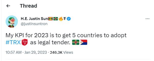Джастин Сан в Twitter "Мой KPI на 2023 год — принятие TRX в качестве законного платежного средства в 5 странах" 29 января: Сан намекнул на принятие TRX в качестве законного платежного средства в “крупной стране”. 28 января: "страна" скоро легализует TRX в качестве законного платежного средства. Этот шаг позволит криптовалютам в ее экосистеме быть “признанными правительством в качестве действительной формы оплаты товаров и услуг”. Недавно Tron получил признание в некоторых странах. TRX был принят в качестве законного платежного средства в Сент-Мартене и Доминике. Сан также является послом Гренады во Всемирной торговой организации. Количество ежедневных активных юзеров по разным блокчейнам - Tron 3,2 млн - BNB Chain 781 тыс. - Polygon 344 тыс. - Ethereum 324 тыс. - Solana 135 тыс. - Near 67,9 тыс.