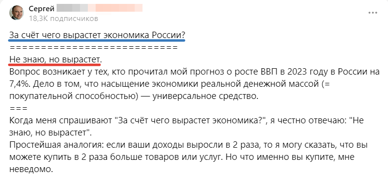 Вопрос возникает у тех, кто прочитал мой прогноз о росте ВВП в 2023 году в России на 7,4%. Дело в том, что насыщение экономики реальной денежной массой (= покупательной способностью) — универсальное средство."