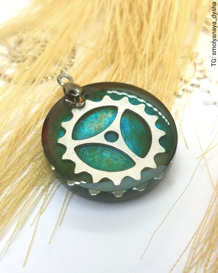 Красивый кулон в стиле стимпанк / механизмы - да в общем-то это просто залитая шестерня 😉 Материал: эпоксидная смола. Заливалось в несколько слоёв: 1. Шестерня в молд + вокруг смола разного цвета, потом жду полного застывания этого слоя. 2. Далее сверху прозрачный слой до застывания. 3. Потом вытащила из форма, наклеила сзади поталь и дополнительно залила смолой. 4. После полного застывания - шлифовка / полировка краев. Видео-осмотр: Тут ещё больше всяких штучек 😺 Читайте также.