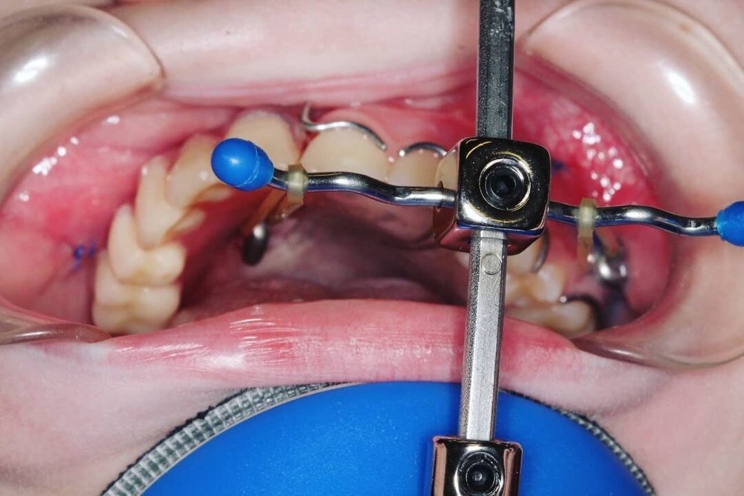 Что делать? Пациенту с опухолью верхней челюсти была проведена: Первым этапом (самым важным жизнесохраняющим): Частичная резекция верхней челюсти с одномоментой реконструкцией фрагментом васкуляризированного малоберцового костного лоскута. Вторым этапом был изготовлен съёмный протез на место удалённой челюсти для социализации (сохранить эффект целостнлсти верхней челюсти и зубов), нормального функционирования и для предотвращения вторичной деформации (смещения зубов). Третий этап: Нарушение целостности верхней челюсти и отсутсвие потенции к росту у малоберцового лоскута приводит к нарушению роста верхней челюсти В последствии это приведёт к деформации лица. Поэтому наша задача и цель - попытаться стимулировать рост верхней челюсти. Для этого на верхнюю челюсть установили титановые имплантаты. К ним крепится внеротовая тяга (маска). Эту маску ребёнок одевает на ночь и днём пока находится дома. В среднем 14-18 часов. Что бы можно было использовать эту конструкцию одновременно со съёмн