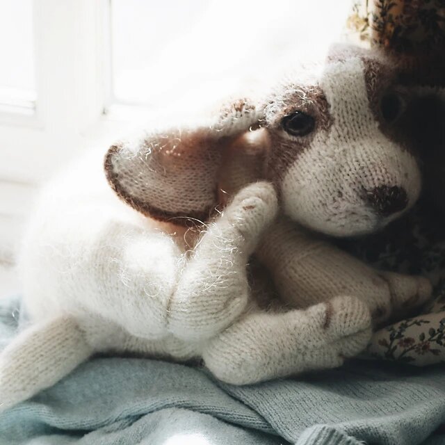 Начинаю вязать щенка, именно он у нас выиграл во втором голосовании. Длина готовой игрушки должна получиться 44 сантиметра. Чуть-чуть смешанное чувство из-за того что половины ниток нет в интернет-магазинах (поставки ниток этой фирмы не осуществлялись в нашу страну вообще никогда), но основной белый цвет состоит из двух нитей: Drops Sky и Drops Kid-Silk. Решила, что недостающие нитки (фирмы Knitting for Olive) тоже будут фирмы Drops, из них сделаны пятна на теле щенка и уши. Вяжется щенок спицами 3,50 мм. Также понадобится пара коричневых глаз 18 мм. Я приобрела две пары — светло-коричневые и тёмно-коричневые, посмотрю, какая пара будет красивее. Вчера начала переводить описание, мне кажется щенок должен получиться интересным: чуть ассиметрично сделана разметка цветом на его мордочке, ассиметричный цветовой переход от коричневой шеи к белой спине, ассиметричное коричневое пятно на спине. Толстенькие лапки с вышитыми коготками и подушечками на обратной стороне. Вообщем, рискнём сделать