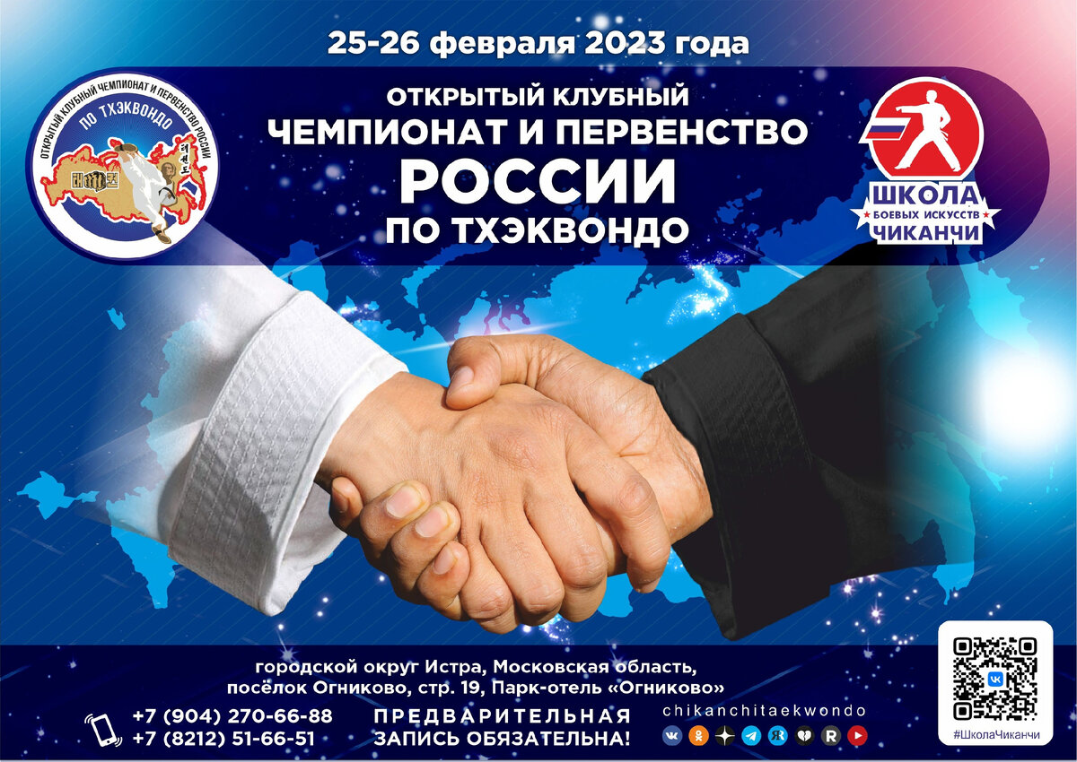 25-26 февраля 2023 года в Подмосковье на Истре Школа боевых искусств Анатолия Чиканчи проведет Первый клубный чемпионат и первенство России по тхэквондо. Спортивные делегации примет парк-отеле «Огниково», расположенный в одноименном поселке в Истринском районе – любимом месте отдыха жителей Москвы и гостей столицы. Загородный комплекс находится на территории свыше 40 га, окружен лесом, живописными озерами, лесопарками с древними липами и соснами, парковыми аллеями. Чистый воздух и отсутствие вблизи проездных дорог – отличная возможность совместить приятный отдых и радость спортивных побед в компании друзей и единомышленников. Приглашаем спортивные команды, школы, клубы, федерации, отдельных спортсменов принять участие в соревнованиях. Регистрация открыта до 20 февраля включительно. Запросить положение и зарегистрироваться: 📩 taekwon.do@mail.ru Связаться с оргкомитетом: 📲 +7(904)270-66-88 📞 +7(8212)51-66-51 Жмите «Лайк» и подписывайтесь на наш канал.