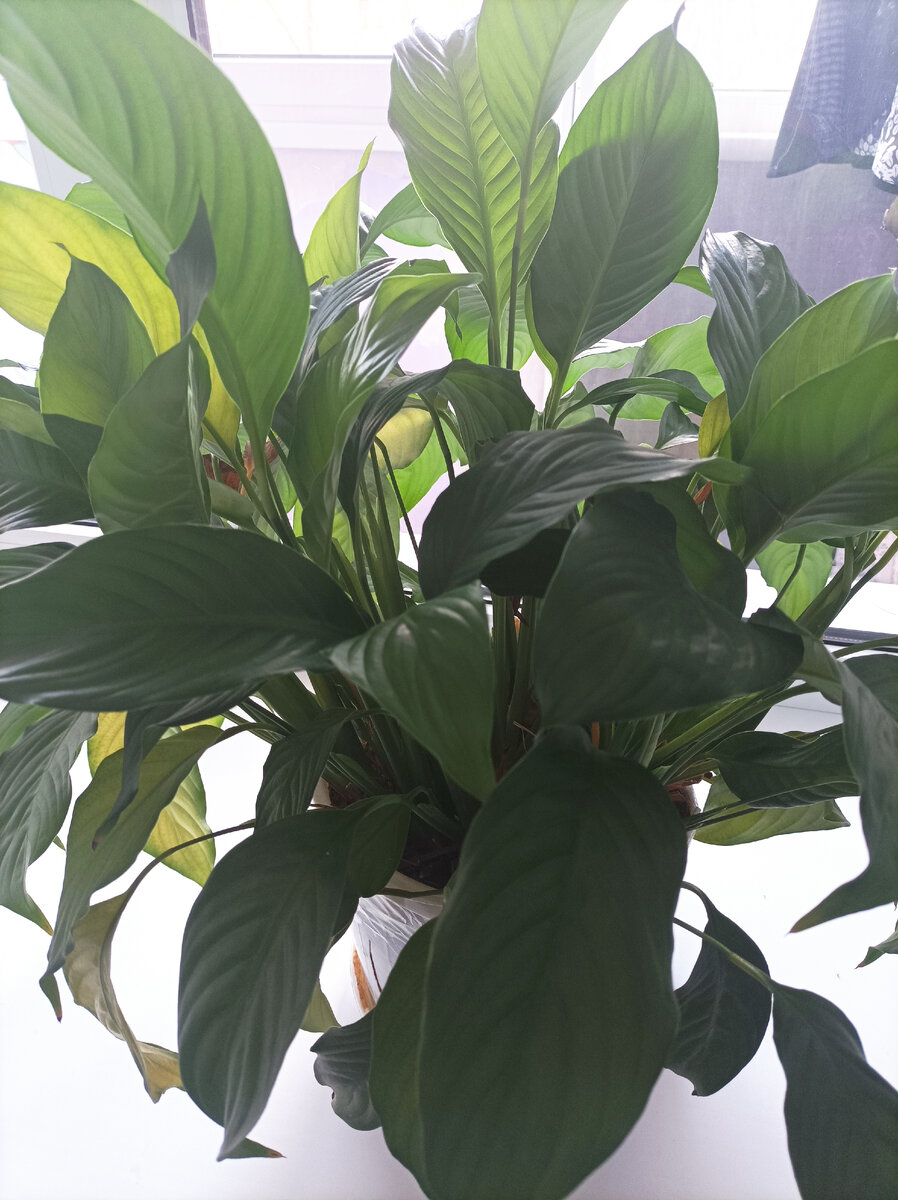 Вчера наконец пересадила свой спатифиллум. А собиралась это сделать ещё летом 🤦♀️Он стоял в треснутом горшке и уже туда не вмешался. Земля постоянно пересыхала, потому что корням нужно было много воды. Но то пешком проходила мимо цветочного магазина, не хотела землю и горшок в руках нести, то забывала, то горшков нормального размера не было, то лень одолевала 😆 Да и много света закрывал, ведь гостиная и так выходит на лоджию, а из-за этого темно, особенно в пасмурные дни. А за последние два месяца солнце у нас было раза 3-4. В последние годы ноябрь, декабрь и январь часто такие. Один отросток пересадила в обычный белый горшок и поставила на подоконник. Второй отросток посадила в такой горшок. Наверно заберу на работу. Он пёстрый, дома ни к чему не подходит. Но ещё подумаю. Часть забрала мама, часть завезли знакомой, два выставила на продажу в барахолке местной, но никто не отозвался. Стоят пока в ванной в вазе. Еще в гостиной на подоконнике стоит денежное дерево - уже старичок,