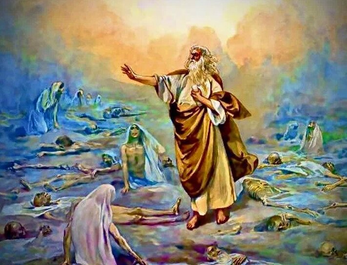 Пророк увидел поле с человеческими костями. И сказал ему Господь: сын человеческий, видел ли ты это? Воскреснут ли эти кости? Иезекииль ответил: «Господь знает это». Тогда Господь дал ему повеление и власть поднять кости, и Иезекииль увидел, как мало-помалу возложили на тело, но духа еще нет в теле. Тогда Господь повелел Иезекиилю дать ему Духа. Вот как описывает это в Библии пророк Иезекииль: «И сказал он мне: пророчествуй этим костям и скажи им: кости высохли; Услышьте слово Господа. Так говорит Господь Бог: вот, Я наведу на вас Духа, и вы оживете.