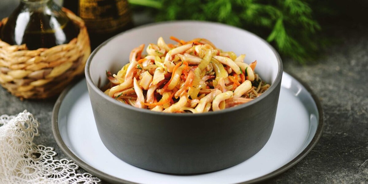 Лапша и яркая на вкус морковь отлично дополняют нежные морепродукты. Время приготовления Ингредиенты Приготовление 1․Фунчозу залейте кипятком примерно на 4–5 минут, точное время смотрите на упаковке. Слейте жидкость, добавьте соевый соус и перемешайте. 2․Кальмаров опустите в кипяток, после повторного закипания проварите несколько секунд и ополосните под холодной водой. Нарежьте соломкой. 3․Лук нарежьте половинками или четвертинками колец. Обжарьте в масле до мягкости и лёгкой румяности. Слегка остудите. 4․Сложите в миску фунчозу, кальмаров, лук и морковь. Хорошо перемешайте с рубленым укропом.