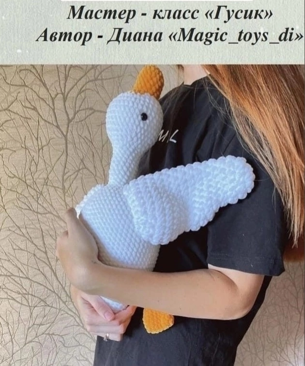 Мастер - класс «Гусик» Автор - Диана «Magic_toys_di» Уровень сложности — средний. Мастер-класс не содержит уроков по вязанию крючком, необходимы основные навыки. Но в нем представлено подробное описание и фото каждого элемента Мастер – класс БЕСПЛАТНЫЙ Мне будет очень приятно посмотреть на Ваши игрушки, отмечайте мою страницу в Instagram https://instagram.com/magic_toys_di?igshid=YmMy M TA2M2Y= Вы всегда можете обратиться ко мне за помощью на любом этапе вязания. Спасибо большое за понимание и уважение к моему труду! Удачи Вам и ровных петелек! Необходимые материалы и инструменты: ПРЯЖА Wolans Bunny Baby No 01 (2 мотка) основной No 38 (1/2 мотка) для клюва и лапок Любая черная пряжа для ноздрей. Глазки - 10 или 12 мм Инструменты: 1. Крючок No 4,5 (основной); крючок No 6 (для крыльев). 2. Ножницы 4. Маркеры для вязания 5. Игла длинная с большим ушком 6. Нитка в цвет основной пряжи (для пришивания деталей). Можно пришивать и плюшевой пряжей. Гусик получается 45 см, в зависимости о