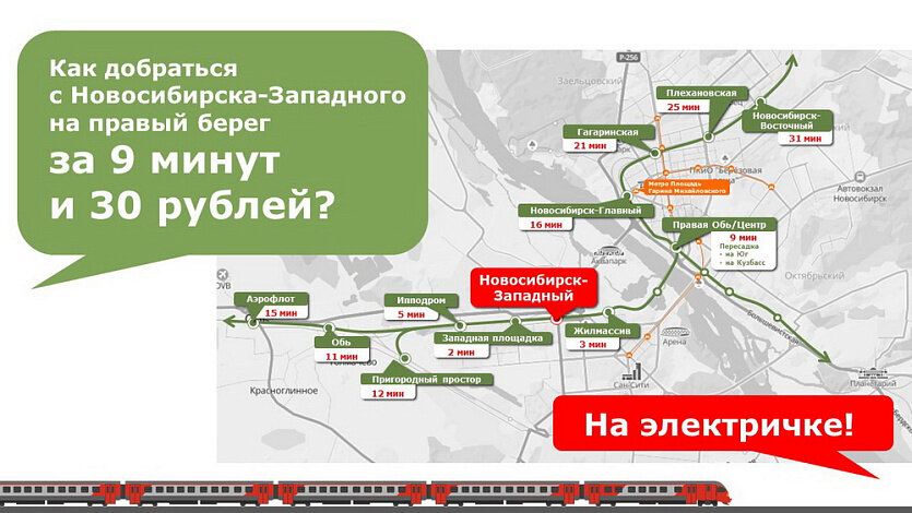 В министерстве транспорта Новосибирской области показали, как можно быстро, без пробок и пересадок попасть с одного берега на другой. Лариса Сокольникова Проект «Городская электричка» в Новосибирске запустили в июле 2021 года. По данным минтранса, за 2022 год она перевезла 6 млн пассажиров. В ведомстве подчёркивают, что по скорости проезда с левого берега на правый этот вид транспорта не уступает метрополитену. Более того, подземка и городская электричка равноценны и географически дополняют друг друга. От остановочной платформы Жилмассив, с которой уезжают жители улиц Планировочной, Выставочной и Ватутина, до правого берега электропоезд идёт шесть минут. Инфографика: министерство транспорта Новосибирской области Со станции Новосибирск-Западный (улицы Станционная, Широкая, Троллейная) — девять минут. С остановки Западная площадка (Связистов, Забалуева, 2-я Станционная) — 11 минут. «Поскольку железнодорожный транспорт фактически стал альтернативой подземке, многие горожане перестали его